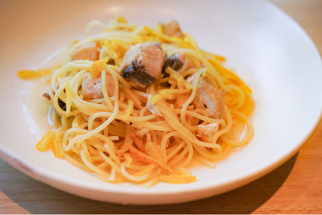 レモンと柚子の果汁と皮を使用しました。サワラは、ごろっと大きめに仕上げており、旨味もしっかり味わっていただけます。食感と爽やかな香りを楽しんでいただける夏にぴったりのパスタです。