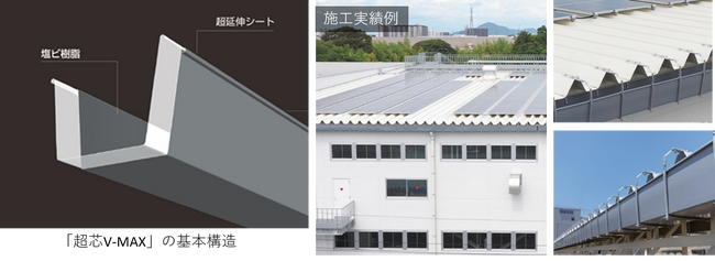 「超芯V-MAX」は、超延伸シートと塩ビ樹脂の3層構造で構成される業界最大級の大容量雨といです。大型の物流倉庫等で使用される金属加工といと同等の排水能力を実現するとともに、専用金具を品揃えすることにより、現場作業の軽減、施工品質の向上を実現できることから、発売開始よりすでに多くのお引き合いをいただいています。