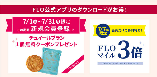 また、7月1日(土)~7月31日(月)期間中の新規会員登録で、FLO人気の焼菓子「チュールブラン1個無料クーポン」をプレゼント!まだ「FLO公式アプリ」をお持ちでない方は、大変お得なこの機会に、ぜひダウンロード&会員登録をお願いいたします。
