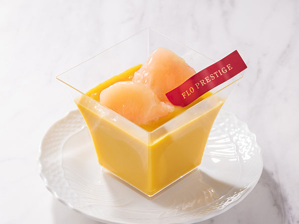 アルフォンソマンゴーを使用した濃厚なマンゴープリンに、優しい甘さの白桃を飾りました。