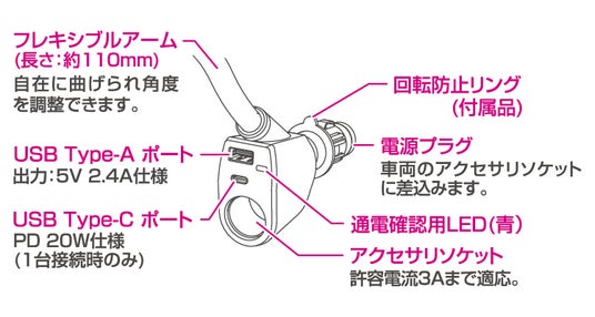 スマホをホールドしながらUSBポートとアクセサリソケットを同時に使うことができます。