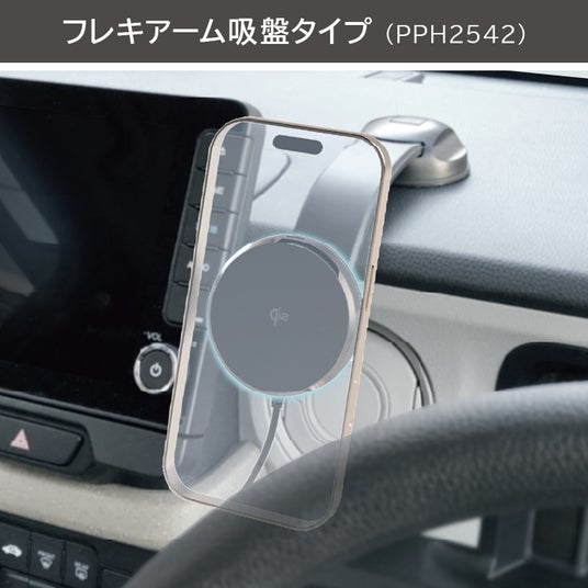 Qi2対応のワイヤレス充電マグネットスマホホルダーで、4つの取付タイプが同時発売。アクセサリソケット取付タイプ(PPH2540)、吸盤タイプ(PPH2542)、エアコン取付タイプ(PPH2543)、貼付けタイプ(PPH2545)