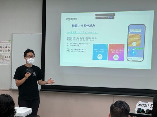 - 参加者は日常の中で無意識にスマートバスマットで体重計測ができ、体重変化がLINEで通知されるほか、LINEで24時間いつでも減量や健康に関する相談をすることができる