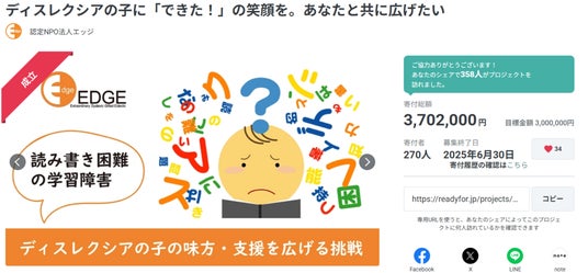 ディスレクシア支援団体の認定NPO法人エッジ(東京都港区 会長:藤堂栄子)は、ディスレクシアの子の味方・支援を広げるために、クラウドファンディング【ディスレクシアの子に「できた!」の笑顔を。あなたと共に広げたい】に50日間挑戦してまいりました。最終日の2025年6月30日には、270名もの皆さまから、目標金額300万円に対し123%達成の3,702,000円のご支援をいただき、クラウドファンディングを終了いたしました。