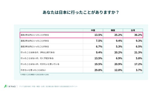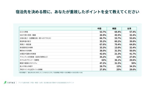 AI搭載型の店舗情報発信・分析プラットフォーム「STOREPAD(ストアパッド)」を運営するイクシアス株式会社は、中国、韓国、台湾 各国20歳以上の男女1,000人を対象に、日本旅行における宿泊施設選びの実態についてアンケート調査を実施しました。
