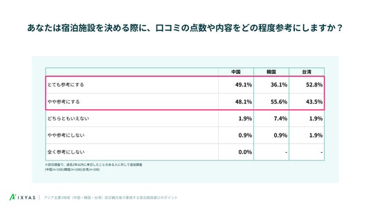 口コミを参考にする層(「とても参考にする」+「やや参考にする」)では、台湾(96.3%)と中国(97.2%)は、口コミを重視する傾向が強い。
