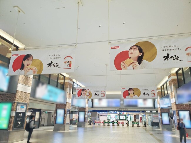 フジパン株式会社(愛知県名古屋市)は 2023 年9月 13 日(水)より 9 月 19 日(火)の 7 日間、西日本鉄道福岡(天神)駅(福岡県)構内にて大型広告を掲出しています。(以下西鉄)フジパンは 2023 年7月 1 日より、本仕込キャラクターとして女優の綾瀬はるかさんを起用しており、西鉄福岡(天神)駅構内では、綾瀬はるかさんのメッセージポスター