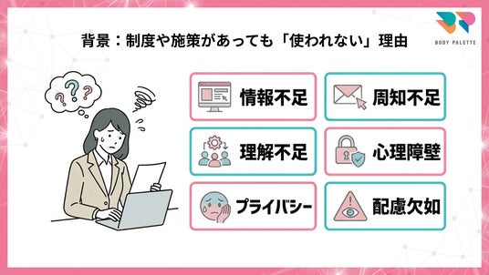特に女性の健康課題は、センシティブ情報を含むため、周知の言い回しや導線設計が不適切だと「見られたくない」「利用が知られたくない」という心理的ハードルが残り、利用に結びつきにくくなります。