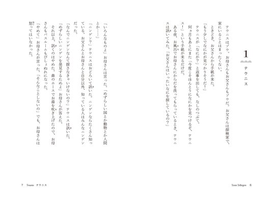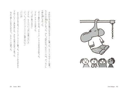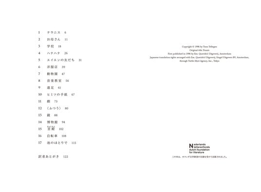 本作は、『ハリネズミの願い』から 18 年さかのぼる 1997 年にオランダで刊行され〈銀の石筆賞〉を受賞しました。トーン・テレヘン作品は、当初から詩人谷川俊太郎氏が高く評価し、日本での紹介を勧めたことも知られています。本書では「周りはみな人間で、自分だけが違う」という状況下で、悩みに直面するゾウの少年の毎日が生き生きと描かれます。読後も様々に考え続けさせてくれる作品です。
