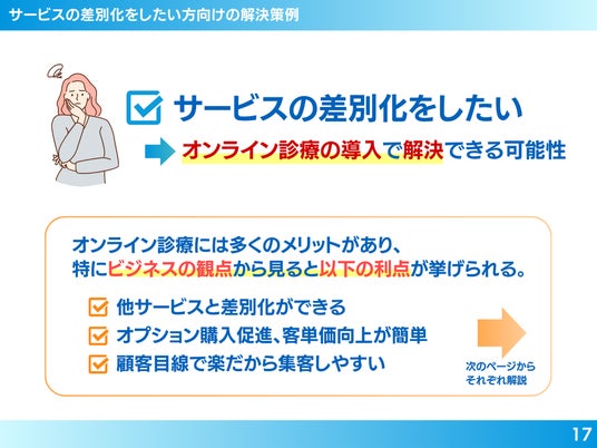 本レポートでは、美容外科・皮膚科業界でサービスの差別化をしたい方向けに解決策もご紹介しています。また、オンライン診療を効率よく導入する方法についてもご理解していただくことが可能です。オンライン診療の集客システム(SEOやリスティング・FB広告など)や運営システム(公式LINEや決済システムなど)の情報など、美容外科・皮膚科業界でサービスの差別化をする際のポイントを具体的な事例をもとに解説しています。