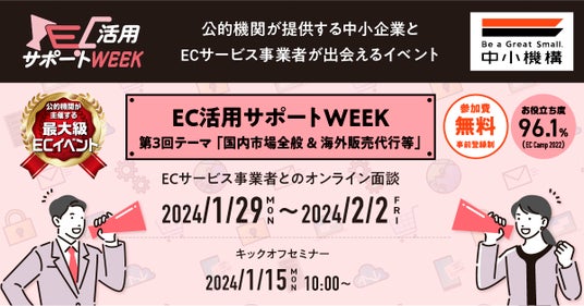 ECサイトの運営代行サービスを展開しているマーケティングアソシエーション株式会社(本社:東京都台東区 代表取締役:中園広和、以下当社)は2024年1月29日(月)~2月2日(金)にオンラインにて開催される『EC活用サポートWEEK:第3回テーマ「国内市場全般&海外販売代行等」』にて、EC専門運用代行サービス「ECサポロジPlus」を出展いたします。