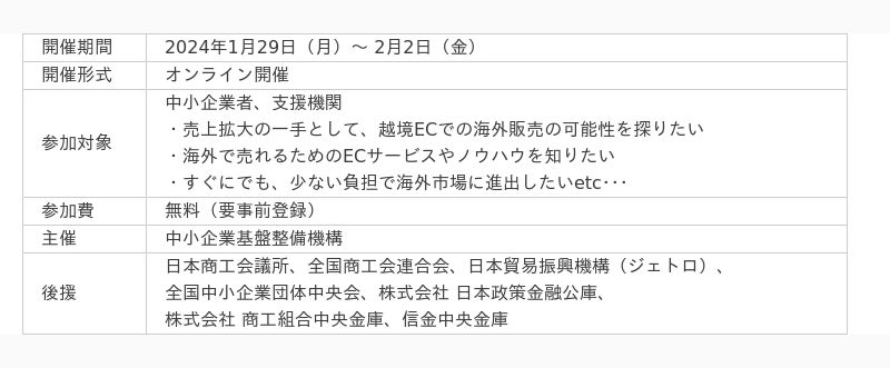 海外市場でいち早く成果を出したい方も、海外販売の将来的な可能性を探りたい方も、奮ってご参加ください。