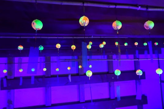 風鈴はブルーライトで照らされると発光する仕様。蔵内は、まるで水の中にいるような幻想的な空間に!