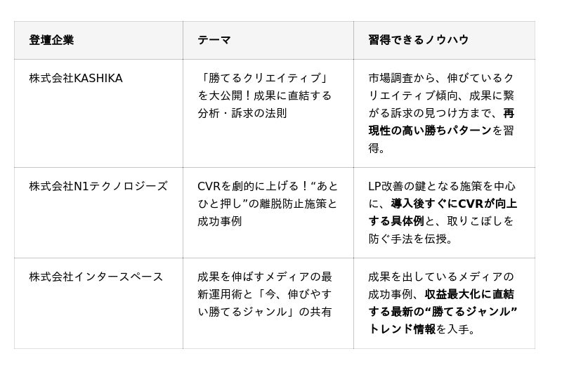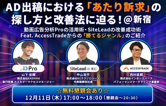 本イベントでは、「動画広告の成果最大化」「LPからの離脱防止施策」「収益性の高いアフィリエイト戦略」の3つのテーマについて、各分野のプロフェッショナルが最新の成功事例と具体的な勝ちパターンを解説します。