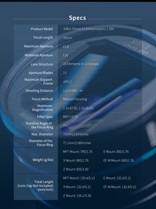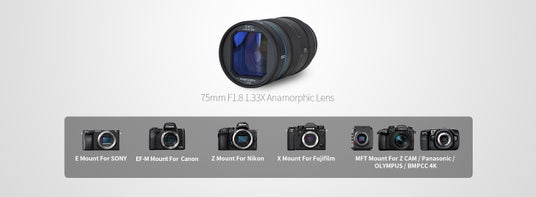 シネマティック体験を広く提供するという目標のもと、SIRUIは50mm、35mm、24mmのワイドスクリーンアナモルフィックレンズを高品質かつ手頃な価格で発表してきました。今回、SIRUIは75mm F1.8 1.33xアナモルフィックレンズを新たにラインアップに加えました。このレンズは、APS-Cセンサーで使用した場合、85mm相当の横長な視野を提供します。これにより、SIRUIのAPS-Cアナモルフィックレンズシリーズが完璧に揃い、プロフェッショナルな撮影のニーズに応えます。