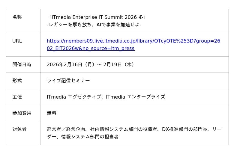 アイティメディア株式会社(本社:東京都千代田区、代表取締役社長 兼 CEO:小林教至、以下アイティメディア)は、2026年2月16日(月)~ 2月19日(木)に「ITmedia Enterprise IT Summit 2026 冬」を開催します。本イベントは「ITmedia エグゼクティブ」と「ITmedia エンタープライズ」が共同で開催するライブ配信セミナーで、AI活用とレガシーモダナイゼーションをテーマに、競争優位性を確立するための戦略を理解する機会を提供します。