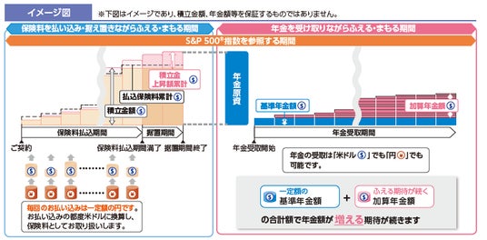 本商品は、保険料払込期間中だけでなく、年金受取期間中もS&P 500(R)指数を参照した運用が続く、米ドル建ての年金保険です。将来の物価上昇、社会保障費の増加等の長生きリスクへの備えに向けた資金の準備にご活用いただけます。