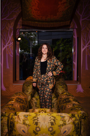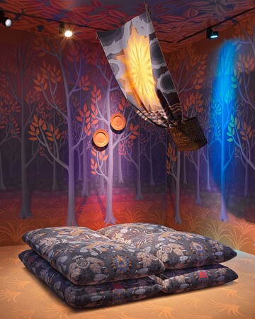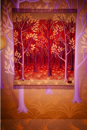 エイミーがエトロのために制作したビジュアルアートは、幻想的なカラーパレットの葉、木、波、雲を描き、自然との繋がりを讃える作品です。作品からさらに4種類のジャカード織のカシミヤブランケットを作り、店内を飾りました。