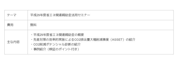 本セミナーでは、平成29年度に想定される省エネ関連の補助金の全体像をご説明いたします。併せて、平成28年度に給付された補助金事例として、CO2削減事業を目的とした省エネ設備導入を補助する「先進対策の効率的実施によるCO2排出量大幅削減事業(ASSET)」と、自社のエネルギー利用状況などを客観的に把握し、削減できる余地(ポテンシャル)がどの程度あるかを診断できる「CO2削減ポテンシャル診断」について、申請手続き等を踏まえてご紹介いたします。