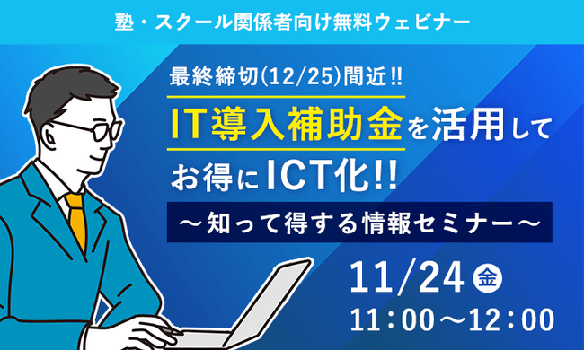 ウェビナーでは、IT導入補助金の申請に関する注意点や、学習塾・放デイ・フリースクール等向けのICT学習教材「天神」法人版の導入について取り上げる予定です。