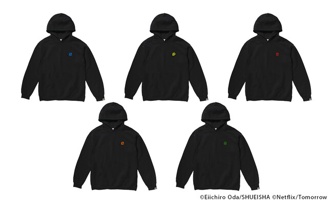 麦わらの一味をイメージしたコラボアイコンを、公式カラーで彩ったパーカー5種がラインナップ