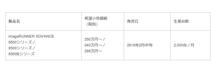 キヤノンは、「imageRUNNER ADVANCE(イメージランナー・アドバンス)」の新製品として、オフィス向け高速複合機“imageRUNNER ADVANCE 6500/8500”シリーズおよび基幹業務向け高速プリンター“imageRUNNER ADVANCE 8500B”シリーズの計3シリーズ9モデルを2016年2月中旬より発売します。