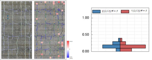 - 劣化進行把握技術:劣化進行の状況は、サイズ可変のメッシュ領域に区切って解析と定量化を行い、ヒートマップおよびヒストグラムにより視覚化された結果により把握する。