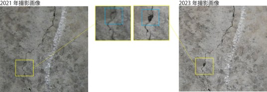 本技術を使用することで、橋梁などのコンクリート構造物の異なる2つの点検時期の撮影画像から、ひび割れなどの劣化進行がAIにより可視化され、角落ちなどの異常を検知できることが確認されました。