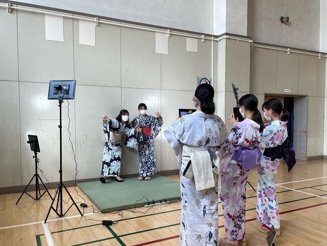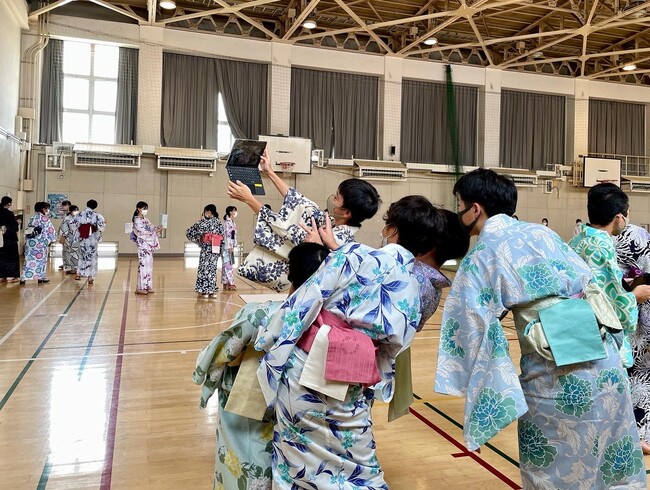 初日は2年生2クラスの授業を実施。生徒の大半が着付けを体験したことがなく、苦労している様子が多々見受けられましたが、だんだんと形になっていく着姿を生徒同士で互いに確認し、嬉しそうにされていたことがとても印象的でした。レッスン後は各自タブレットを活用し、校内を浴衣姿で歩き回り“映える写真”を撮るため工夫を凝らしていました。
