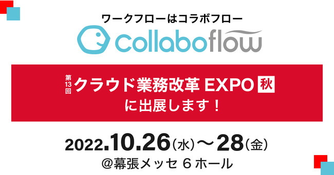 「ワークスタイルの未来を切り拓く」を理念に掲げ、クラウドサービス「コラボフロー」を提供する株式会社コラボスタイル(所在地:愛知県名古屋市、代表取締役社長:松本 洋介、以下 コラボスタイル)は、2022年10月26日(水)から28日(金)まで開催される2022年下半期最大のIT展示会「Japan IT Week 【秋】」に出展します。
