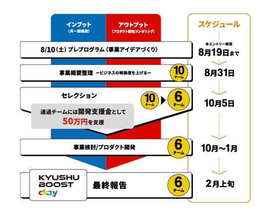 2024年8月31日のキックオフプログラム後、インプットとアウトプットを繰り返しながら、2025年2月2日(予定)の最終報告会での事業アイデアピッチ・プロダクト展示を目指すプログラムです。キックオフ前にはエントリー準備のためのプレプログラムを、プログラム途中にはセレクションを設定しています。セレクションではプロジェクトを6件選抜し、通過チームには開発支援金50万円を支援します。選抜という緊張感の下で各チームが切磋琢磨することを期待します。