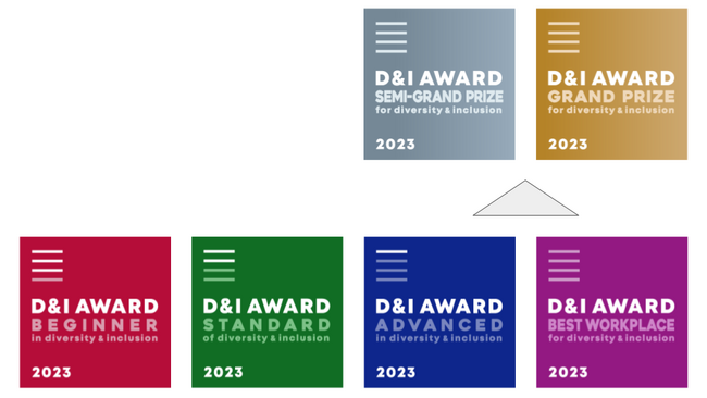 認定企業の中で、特に特筆すべき取組みをしている企業最大15社は、「D&Iアワード大賞」と「D&Iアワード賞」のいずれかの受賞企業を決めるアワード審査の対象になる場合がございます。アワード審査では以下の5つの部門から、各部門3社ずつを選出し、ヒアリングや外部の審査委員会による審査を経てD&Iアワード賞、D&Iアワード大賞の受賞企業を決定いたします。