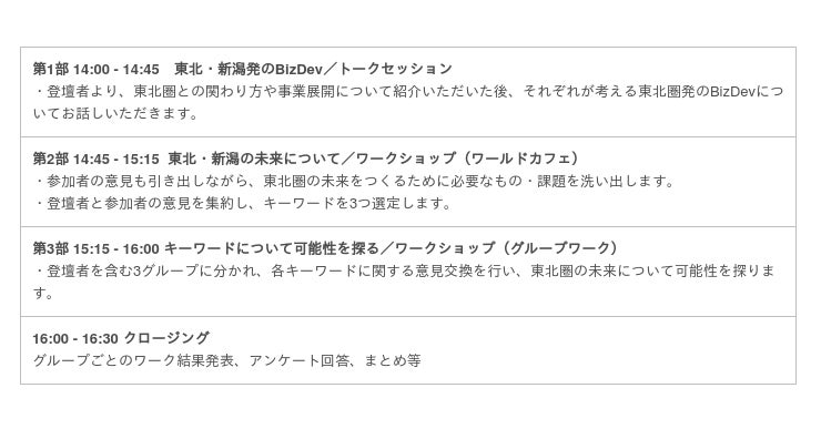 BizDev Meetup!は、「オープンイノベーションで東北・新潟をもっとおもしろく」のコンセプトのもと、「東北6県および新潟県(以下、東北圏)の企業と協働したい」「東北圏で新規事業を興したい」「東北圏をもっと元気にしたい」という熱意をお持ちの方に対して、出会いと学びの機会を提供するイベント型プログラムです。
