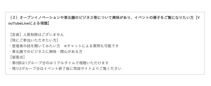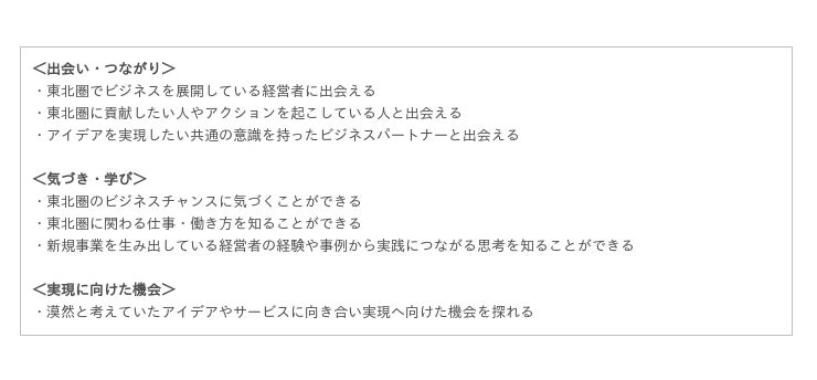イベント当日は、金融機関、行政、東北圏の企業などにも参加いただく予定で、東北圏の活性化、地域課題の解決に寄与する事業共創を目指します。
