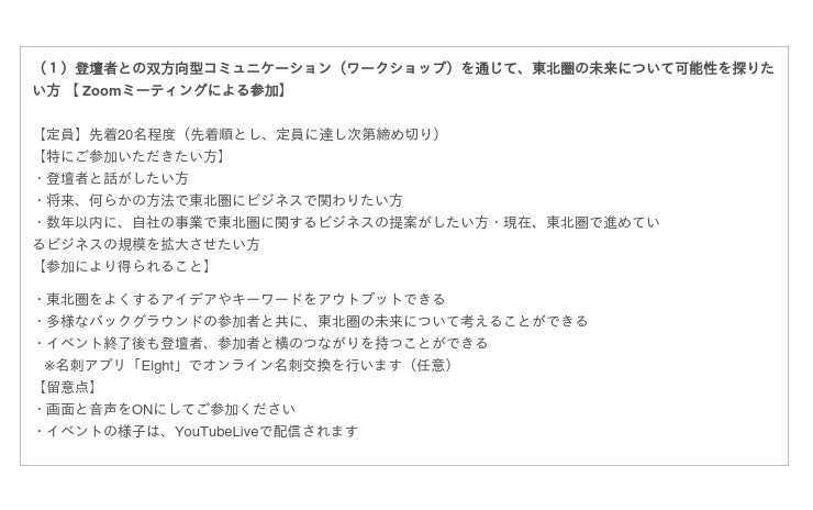 キックオフイベントでは、東北圏で新規事業創出やプロジェクト支援等の実績がある経営者3名をお招きし、「東北・新潟の可能性と未来」をテーマとしたトークセッションやワークショップを通じて、オープンイノベーションに関する意識の醸成を図るとともに、東北圏に新規産業創出や人材育成のダイナミズムを喚起するきっかけを提供します。
