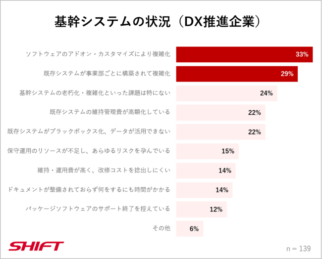 クラウド、IoT、AIが多くの回答を集め、新しいテクノロジーが導入または検討されていることがわかりました。これらはインフラ基盤の変更やデータ統合を伴うものがほとんであることが予想されますが、既存システムが複雑化している状態を放置している場合、特に、多くのアドオンやカスタマイズを伴う状況ではDX推進の妨げになりえます。