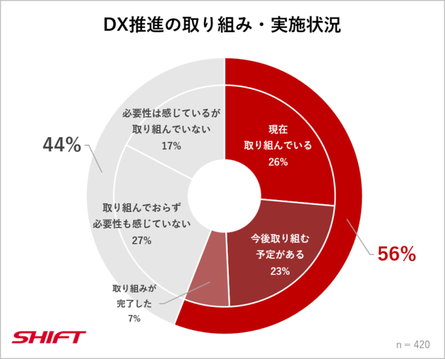 「取り組みが完了した」「現在取り組んでいる」「取り組む予定がある」とした回答は56%でした。IPA 「DX白書2021」(※4)における、業界横断での調査では『日本でDX推進に取り組んでいる企業は約56%』と報告されています。本結果から、物流業界においても同様の取り組み状況であり、DX推進が遅れていないことがわかりました。