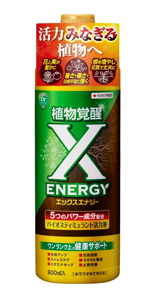家庭園芸用薬品・肥料等を製造販売する住友化学園芸株式会社(本社:東京都中央区/代表取締役社長:梅田公利)は、環境由来のダメージへの抵抗性を高め、収量増加や品質の向上に貢献する、「バイオスティミュラント」成分を配合し、活力みなぎる植物へ導く活力液「X-ENERGY(エックスエナジー)」を新発売いたしました。