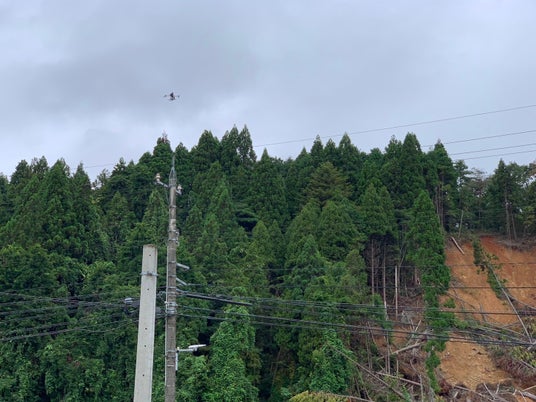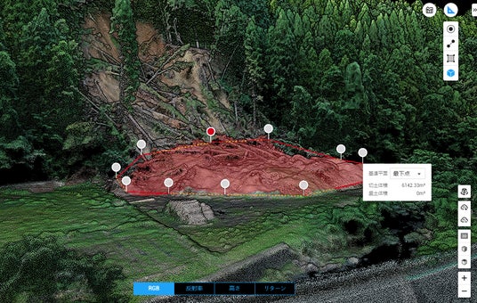 レーザースキャナを搭載したドローンを使用し、崩落現場を測量
