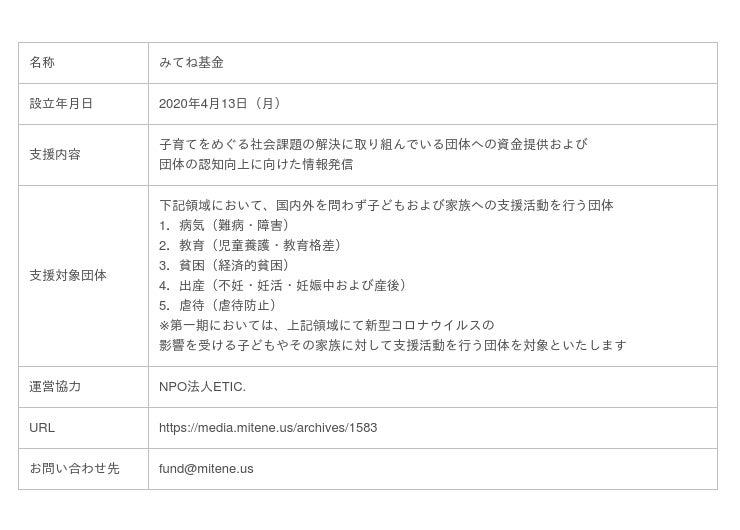 「みてね」は「家族の絆をより深めることができる」「子どもを中心に愛情の架け橋となるような」サービスを目指して開始しました。この4月に提供開始から5周年を迎えるにあたって、その活動をより多くの方たちと行っていくべく、子育てをめぐる社会課題解決に取り組む団体を支援する「みてね基金」の構想を考えておりました。みてね基金の最初の一歩としては、年明けより、未曾有の新型コロナウイルスの感染拡大、被害が発生している状況を鑑み、新型コロナウイルスの感染拡大により生じた、困難を抱える子育て家庭の課題に対して、解決していくアイデアをもっている、行動を起こしている団体に対して支援させていただきたいと考えております。新型コロナウイルスとの戦いは、これから長い年月がかかる可能性があると考えています。短期だけでなく、中長期的に支援できるよう私個人はもちろん、株式会社ミクシィとして活動していきたいと考えております。