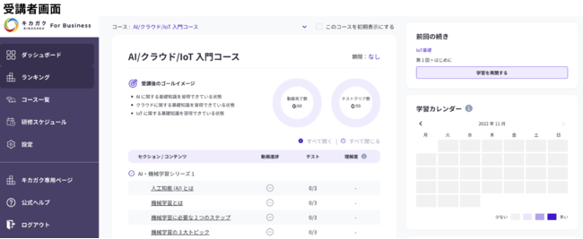 e ラーニング の利用には、DX 人材ラーニング・アセスメントプラットフォーム「キカガク for Business」の導入をおすすめしています。導入をご検討の方には、プラットフォームのデモアカウントを発行しています。 1 企業あたり 3 名までトライアル利用が可能です。ご希望の方は下記お問合せフォームよりご連絡ください。
