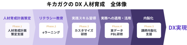 キカガクでは『DX ファーストステップ研修』以外にも、集合型研修や実データを扱う PBL 研修を実施。研修の提供だけではなく、研修の学びが活用に直結するためのロードマップ策定サポートなど、DX 実現までに必要な全フェーズの人材育成を行っています。