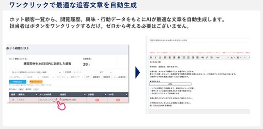 顧客の興味・行動データをAIがリアルタイムで自動学習し、完全個別・高精度な追客文章をワンクリックで生成し、「この担当者は、自分のことをわかってくれている」と顧客に感じてもらえる追客を、住宅・不動産営業の新しいスタンダードとして提供します。