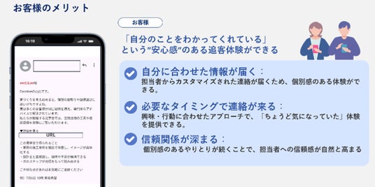 第一弾「AI文章生成機能」のリリース後、イベント案内やフォローメールなどの営業文章を素早く作成し、情報を届けることができるようになりました。一方で、実際に顧客と向き合う場面では、その顧客がどの情報に関心を持ち、いまどのような検討段階にいるかを読み取ったうえで、より個別性が高く、具体的なメッセージを届けることへのニーズが高まりました。