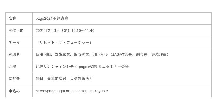 基調講演はサンシャインシティコンベンションセンターにて、2021年2月3日(水)の開会式終了後、10時10分から90分間にわたって開催します。page2021の統一テーマ「リセット・ザ・フューチャー」について、JAGATの会長・副会長・専務理事が議論します。