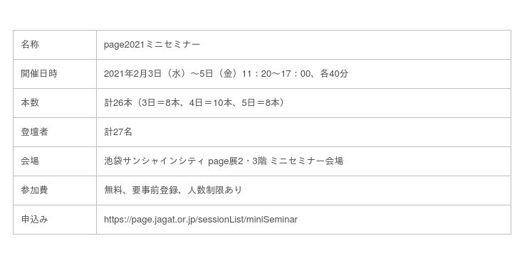 ミニセミナーは、2021年2月3日(水)から5日(金)のpage2021リアル展示会に設けたミニセミナー会場で計26本を開催します。2Fミニセミナー会場ではJAGATプレゼンツとして13本、3Fミニセミナー会場ではスポンサープレゼンツとして13本を展開します。