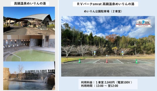 九州周遊観光活性化コンソーシアム(代表機関:トラストパーク株式会社 本社:福岡県福岡市博多区、代表取締役:山川 修)は、通過型地域などの観光振興を目的として広域に展開している車泊(くるまはく)・RVパークsmartを宮崎県の高鍋町「高鍋温泉めいりんの湯」に開設し、2023年12月16日より車泊予約を開始しました(車泊事業モデルは下部※1.参照)。