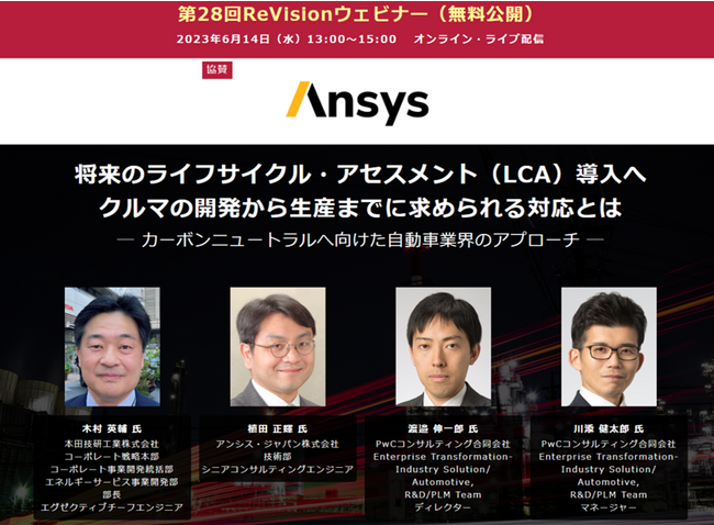 次世代モビリティ分野の情報交流・人的交流を促進するメディアプラットフォーム「ReVision Auto&Mobility」(運営:株式会社InBridges、東京都港区)は、6月14日(水)13:00から2時間、WEBセミナー『将来のライフサイクル・アセスメント(LCA)導入へクルマの開発から生産までに求められる対応とは ― カーボンニュートラルへ向けた自動車業界のアプローチ』を無料配信します。講師には、本田技研工業の木村英輔氏、アンシス・ジャパンの植田正輝氏、PwCコンサルティングの渡邉伸一郎氏と川添健太郎氏の4名を迎えます。