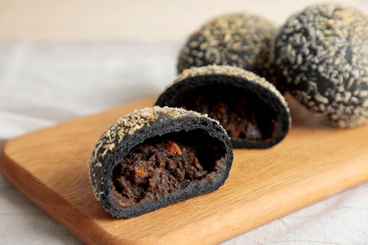 玉ねぎの甘みを感じるマイルドなカレーを詰めた黒いカレーパン。生地には竹炭を練り込み、カレーには食物繊維とポリフェノールが豊富なブラックココアを使用しています。葉酸、乳酸菌を配合し、糖質50%オフ(※)です。