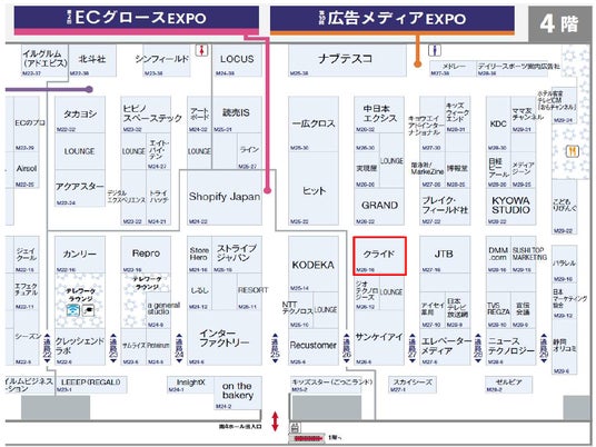 また、出展位置は以下のとおりです。赤色の箇所がクライドのブース(ブース番号:M26-16)となります。